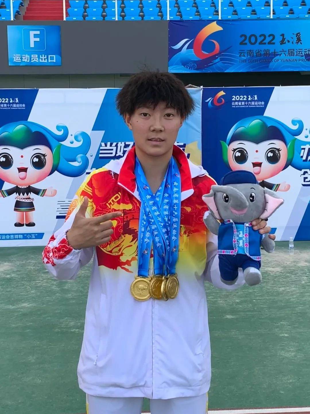 2022年云南省第十六届通顺会上,还在读高三的朱俊颖一鸣惊东说念主,连夺100米、200米和4×400米戮力、4×100米戮力四项冠军。