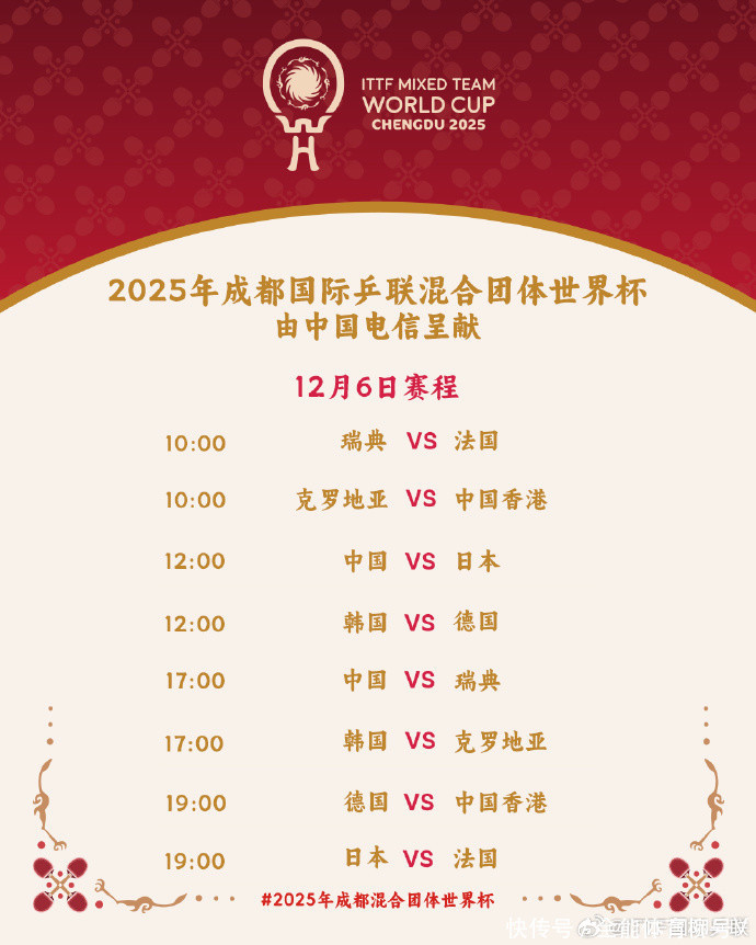 北京时分12月6日音信,2025年景齐外洋乒联羼杂团体全国杯链接进行,CCTV5现场直播比赛实况。第二阶段轮回赛的一场焦点比赛中,卫冕冠军中国队迎战老敌手日本队,比赛时分为12:00。同期段的另一场比赛,中国香港队迎战法国队。下昼17:00,中国队对阵瑞典队。